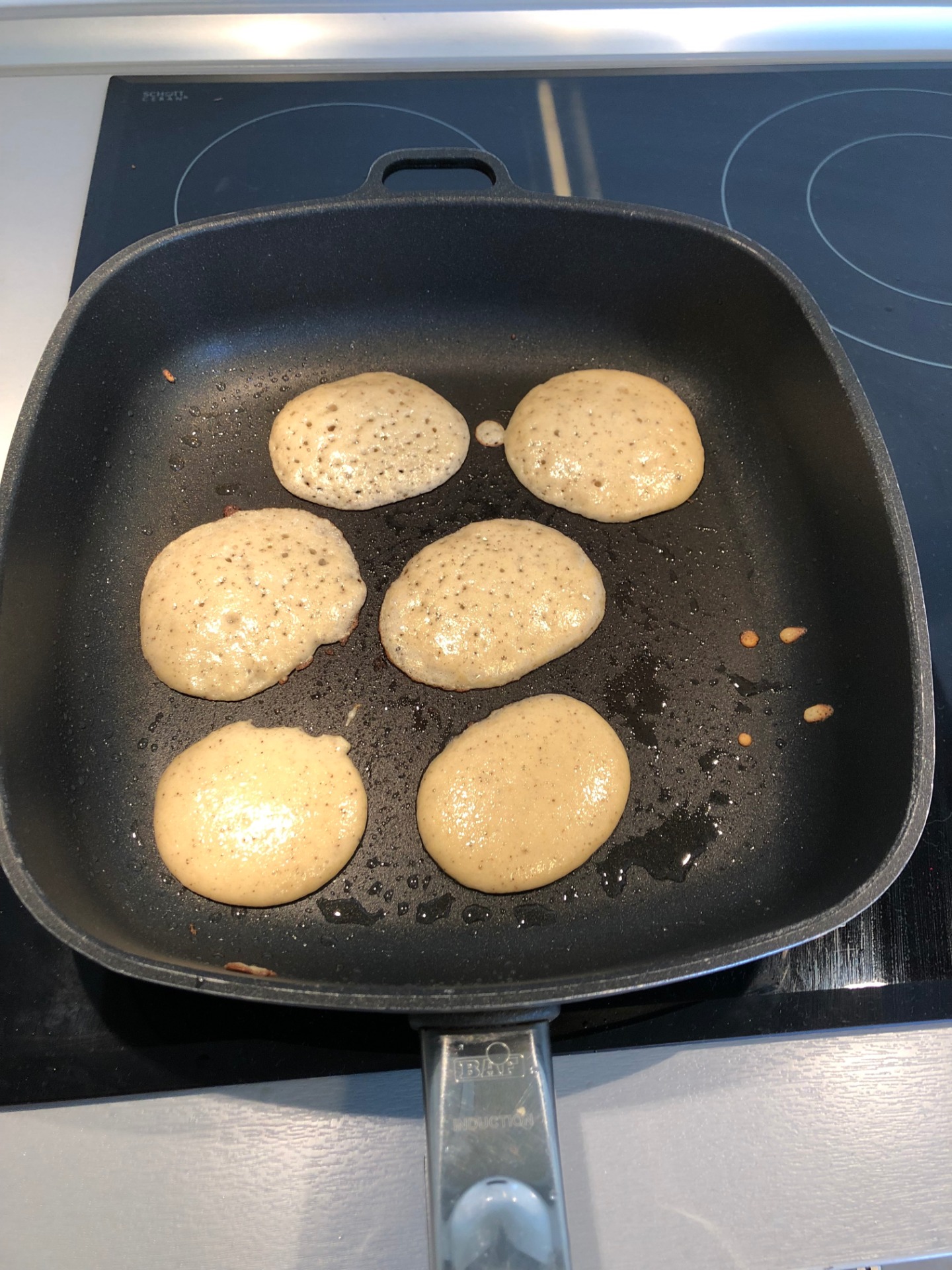 3. Lžící dejte na pánev 4 porce na lívance a opékejte cca 3 minuty z jedné strany a poté 1 minutu z druhé strany.